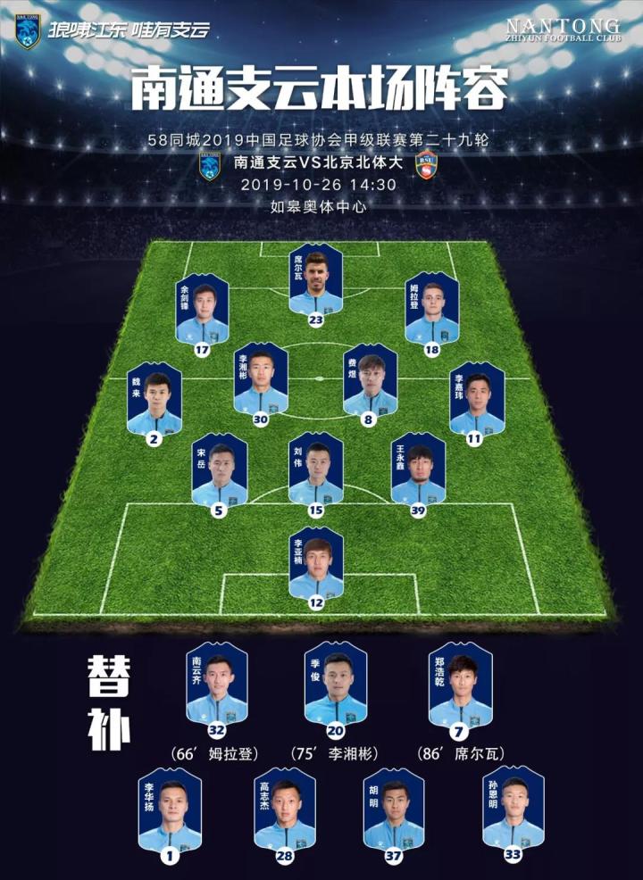 10月26日下午,中甲联赛第29轮战罢,南通支云在主场0-0战平北京北体大,继续在积分榜上保持追赶态势。由于新疆队和四川队本轮都没有赢球,支云队依然有机会在最后一轮通过赢球逆转排名局势。11月2日客战青岛,在祝贺对手提前一轮成功冲超的同时,支云全体将士势必将释放出最大能量,拼下3分!支云战斗!