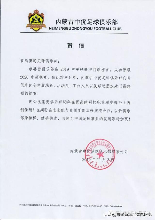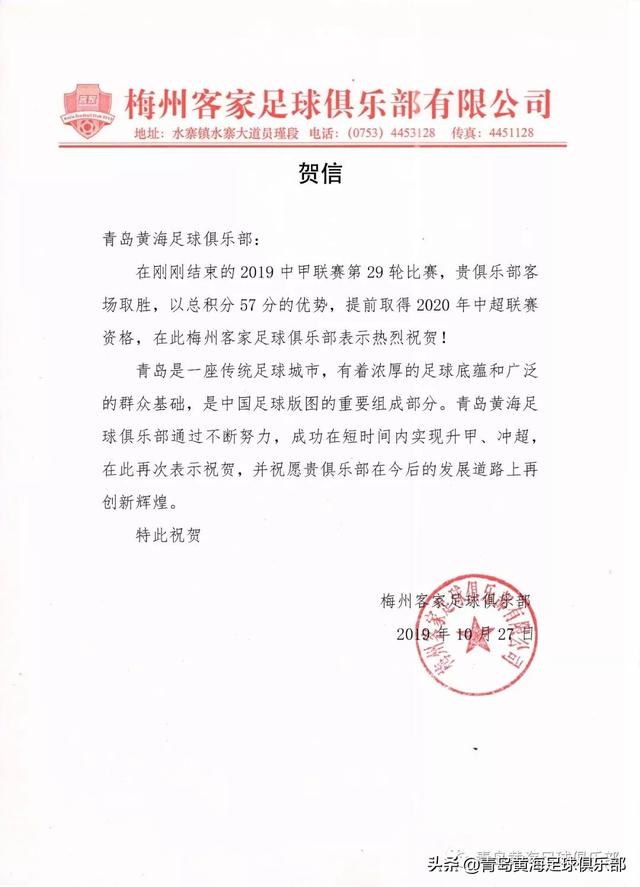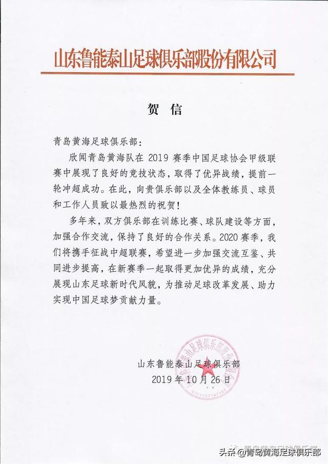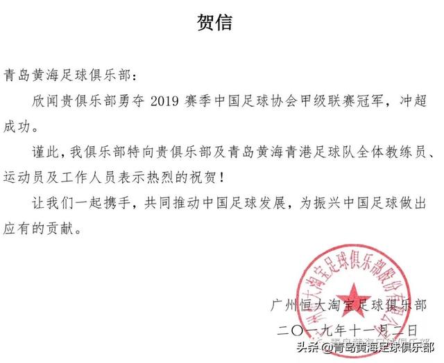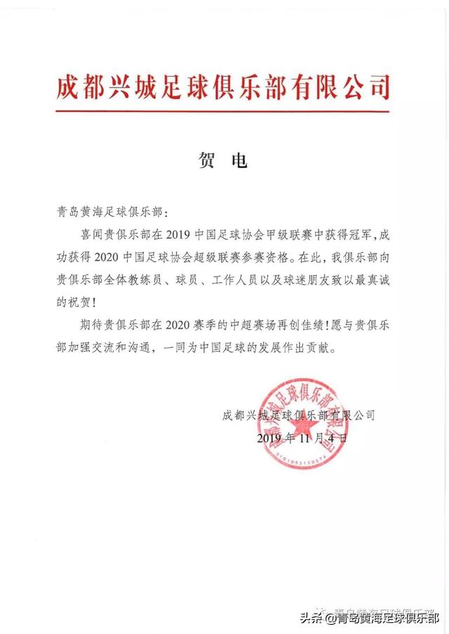 青岛黄海青港队在2019赛季中甲联赛中实现冲超和夺冠目标后,中国足坛多家职业、业余足球俱乐部第一时间发来贺电或通过其他方式向青岛黄海足球俱乐部表达的祝贺。