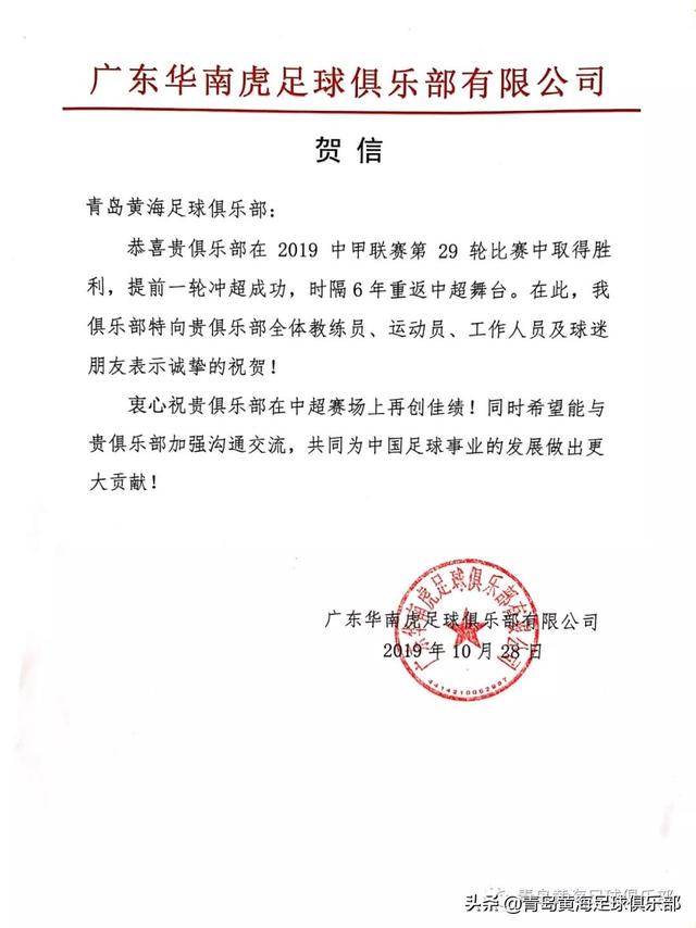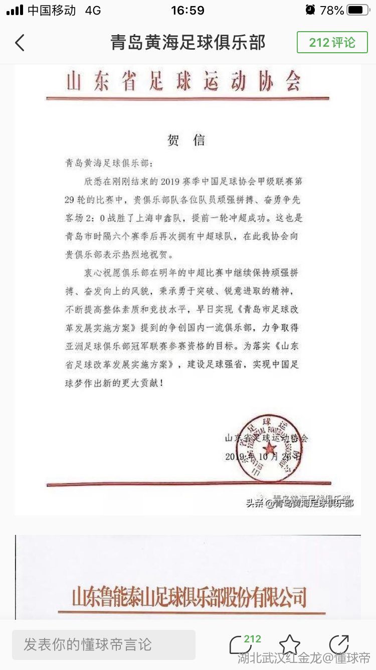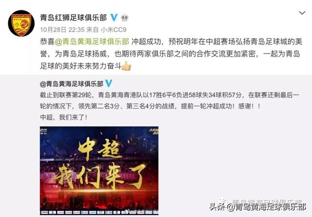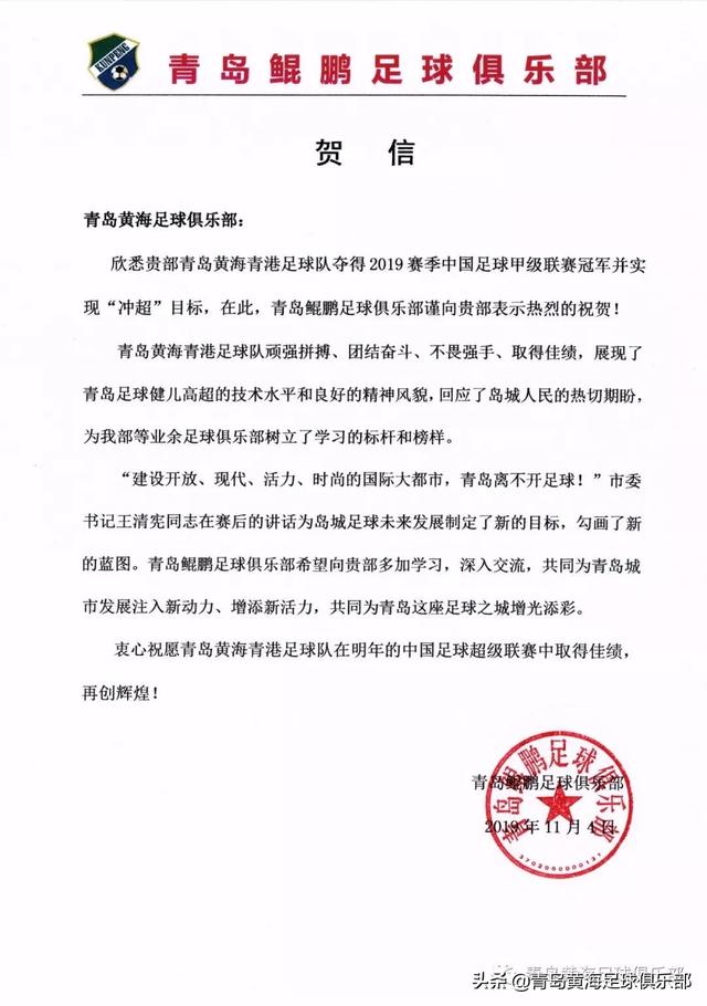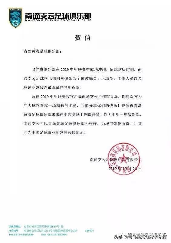 懂球帝首页>动态> 懂球号> 黄海青港冲超夺冠,兄弟球队八方来贺