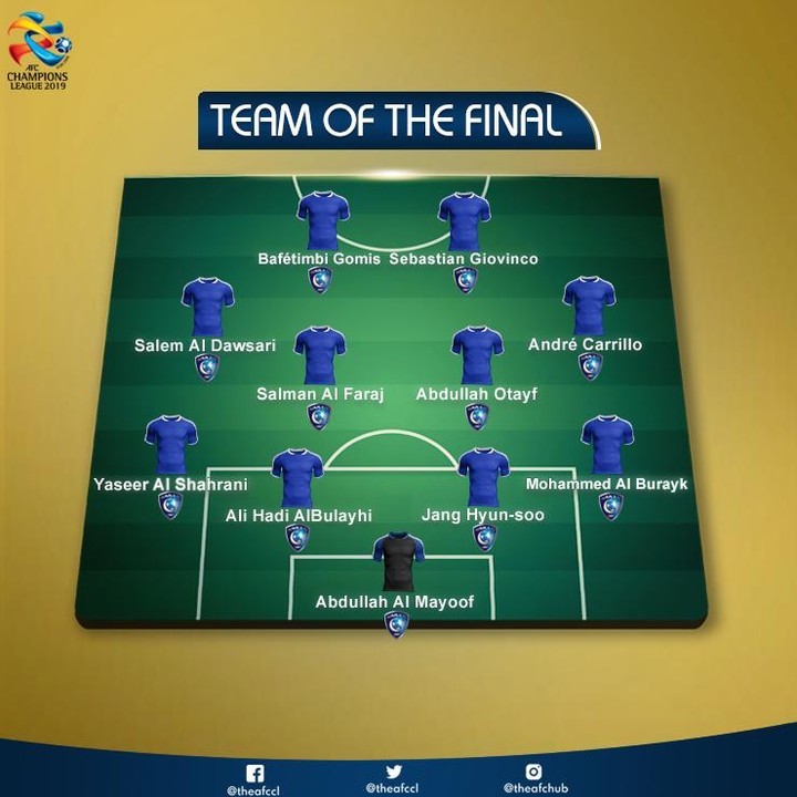 亚冠决赛两回合的较量,利雅得新月派出了完全一致的首发阵容。亚足联官方也将这一最终夺冠的首发评选为了决赛的最佳阵容,利雅得阵中四大外援戈米(法国)、乔文科(意大利)、卡里略(秘鲁)以及张贤秀(韩国)领衔该名单。