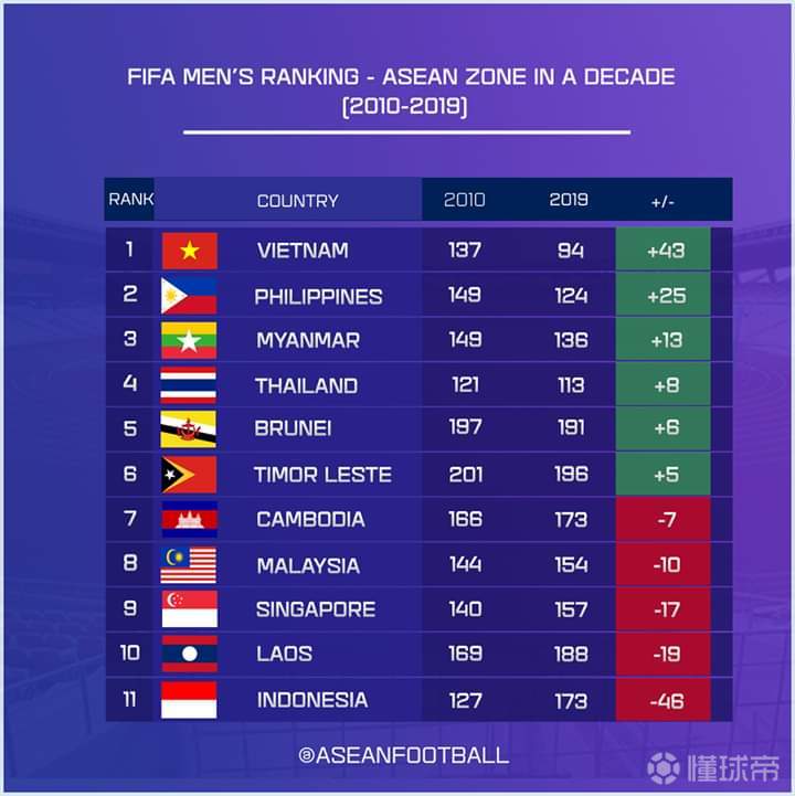 懂球帝首页>动态> 懂球号> 过去十年东南亚国家世界排名情况!(2010-20...