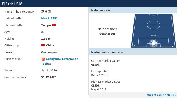 北京时间2月11日,德国转会市场网站更新了广州恒大门将刘伟国的合同动态,他与恒大续约半年。