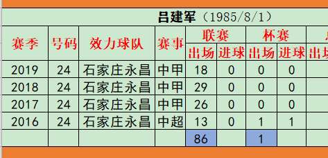 吕建军未参加海外集训,据了解原因是伤病,并未离队。吕建军自2016年以来加盟石家庄永昌,4个赛季总共代表永昌出场87次,其中联赛86次,足协杯1次,1个进球;根据他31-34岁的年龄来看,这个出场率是极高的。吕建军左后卫、右后卫均能胜任主力,撑起永昌队中甲三年的边路防守重任,敬业的态度赢得广大永昌球迷的喜爱。
