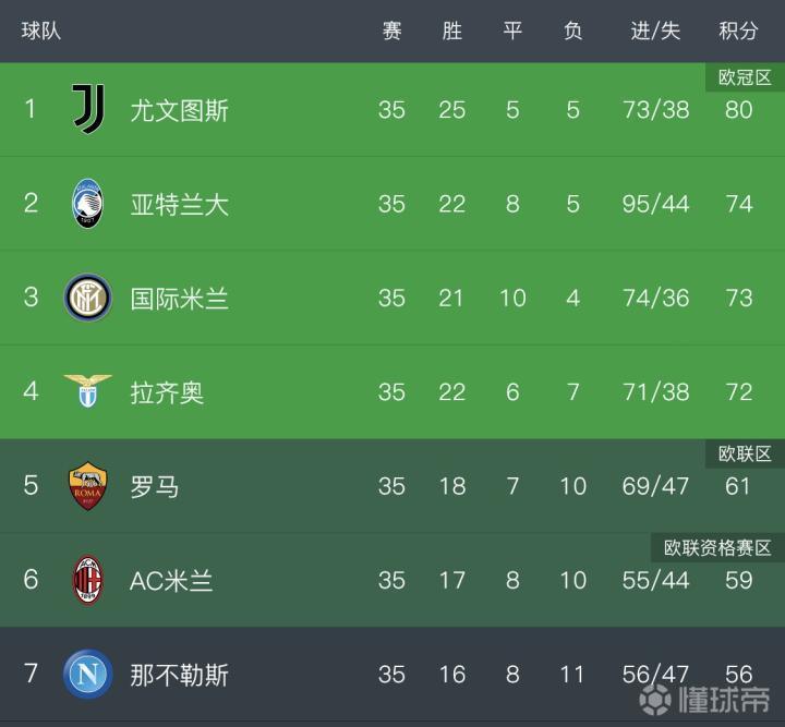 35轮过后,拉齐奥积72分位居第四,领先身后的同城死敌罗马11分,在联赛仅剩最后3轮的情况下,提前锁定联赛第四的位置,获得下赛季欧冠席位。