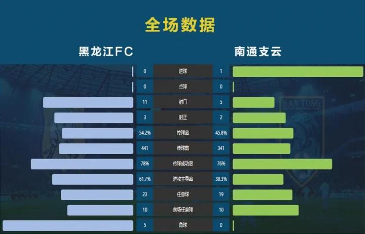 从赛后的数据统计来看,对手黑龙江FC丝毫不落下风,甚至在控球率、传球数、进攻主导方面占据优势。支云的后防线发挥出色,再一次零封对手。联赛五轮过后,南通支云仅失一球,成为三个赛区18支队伍中失球最少的球队。