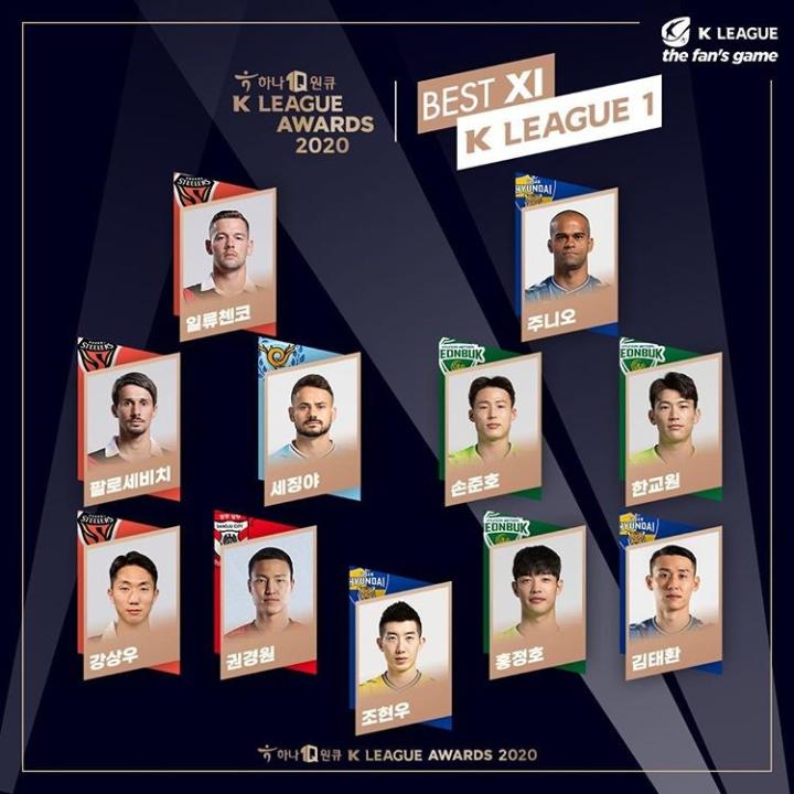 韩国K联赛官方公布了2020赛季韩国K1联赛的最佳阵容,权敬原、洪正好和赵贤祐入选。