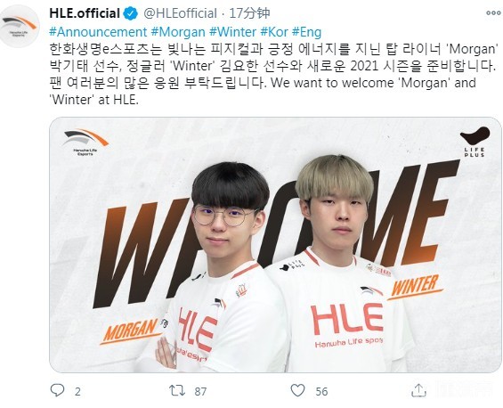 【韩国战队HLE官宣:前WE战队上单Morgan加入】韩国LCK联赛HLE战队官宣,Morgan与Winter加盟。此前Morgan曾效力LPL赛区JDG战队和WE战队,这次加入HLE战队接替冠军上单Cuvee的位置(Cuvee合约到期离队)。Winter来自韩国次级联赛,打野位。