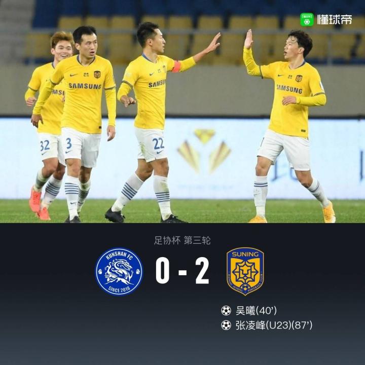 北京时间12月1日晚间20:00,足协杯第三轮,昆山FC对阵江苏苏宁。上半场,黄紫昌禁区内被皮里推倒,但是裁判没有表示,吉翔伤退,吴曦为江苏首开纪录,下半场,谢鹏飞小角度射门击中边网,杨博宇伤退,终场前,张凌峰远射锁定胜局。最终,江苏苏宁2-0昆山FC。