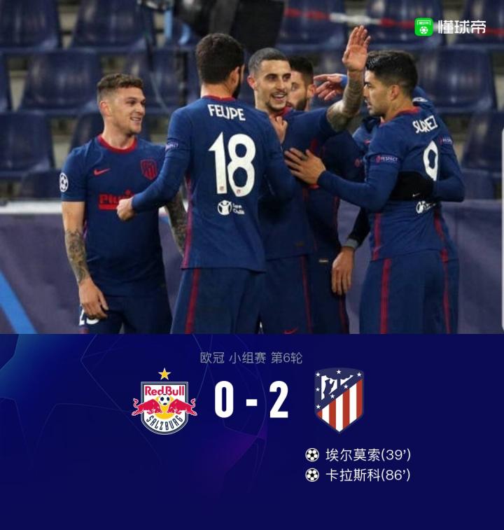 北京时间12月10日04:00,欧冠A组第6轮的一场比赛,马德里竞技客场挑战萨尔茨堡红牛,上半场主队多次制造威胁,贝里沙表现活跃,埃尔莫索头球破门打破僵局。下半场易边再战,索博斯洛伊浪费绝佳机会,姆韦普远射击中立柱,卡拉斯科凌空抽射锁定胜局,最终马竞2-0萨尔茨堡红牛,以小组第二的身份晋级十六强。