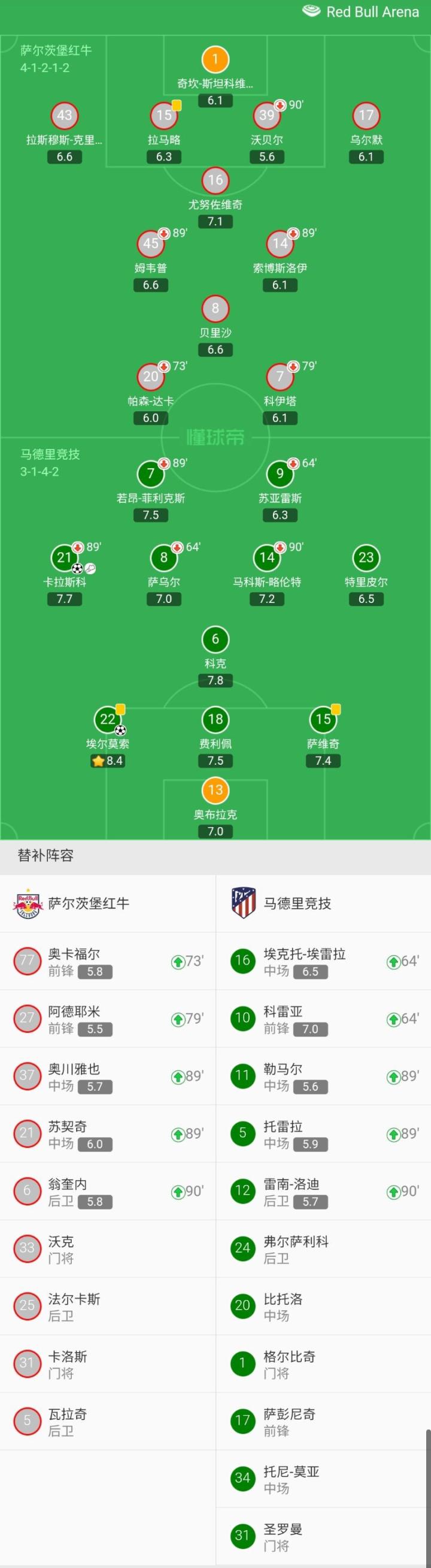 萨尔茨堡红牛首发:1-奇坎-斯坦科维奇、43-拉斯姆斯-克里斯滕森、15-拉马略、39-沃贝尔(90`09-翁奎内)、17-乌尔默、16-尤努佐维奇、45-姆韦普(89`23-奥川雅也)、14-索博斯洛伊(89`23-苏契奇)、8-贝里沙、20-帕森-达卡(73`29-奥卡福尔)、7-科伊塔(78`23-阿德耶米)