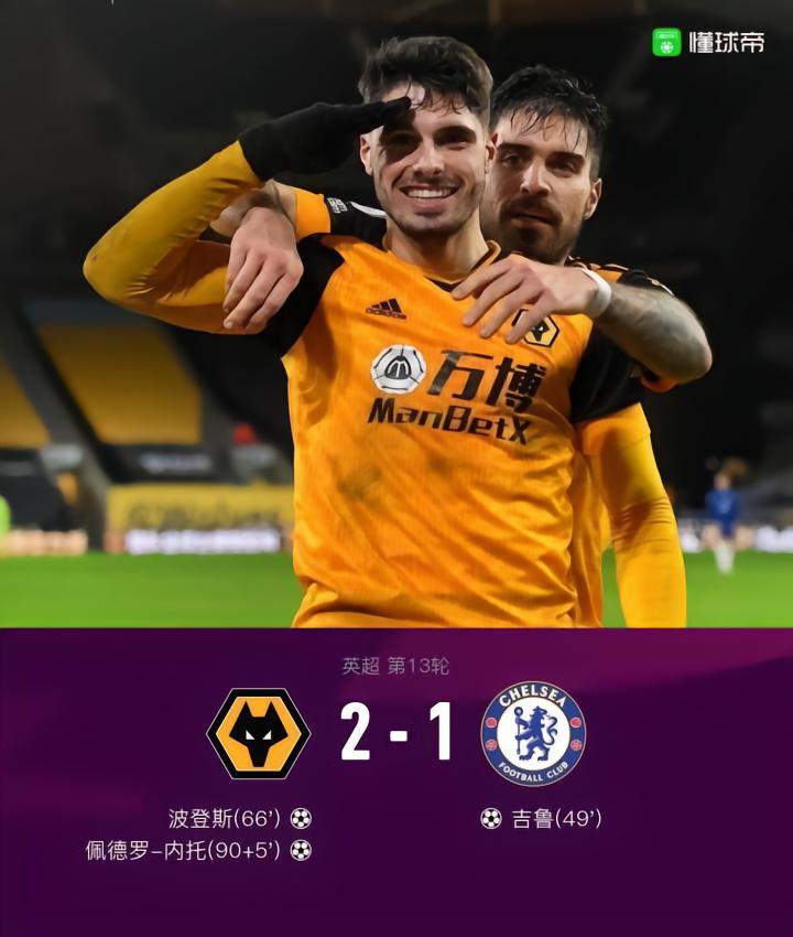 全场比赛结束,切尔西客场1-2遭狼队绝杀。