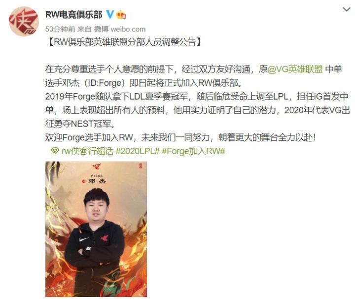 扫描下载懂球帝首页>动态> 懂球号> RW官宣:原VG中单选手Forge正式加入