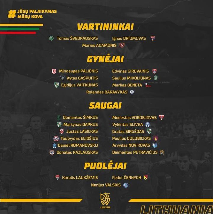 本期名单,效力于乔治罗尼亚的队长切尔尼希、在印度联赛踢球的老将瓦尔斯基斯入选,立陶宛国内球队卡奥纳斯斯皮里斯提供球员最多,有维特库纳斯、达普库斯、西尔格达斯3人在列。
