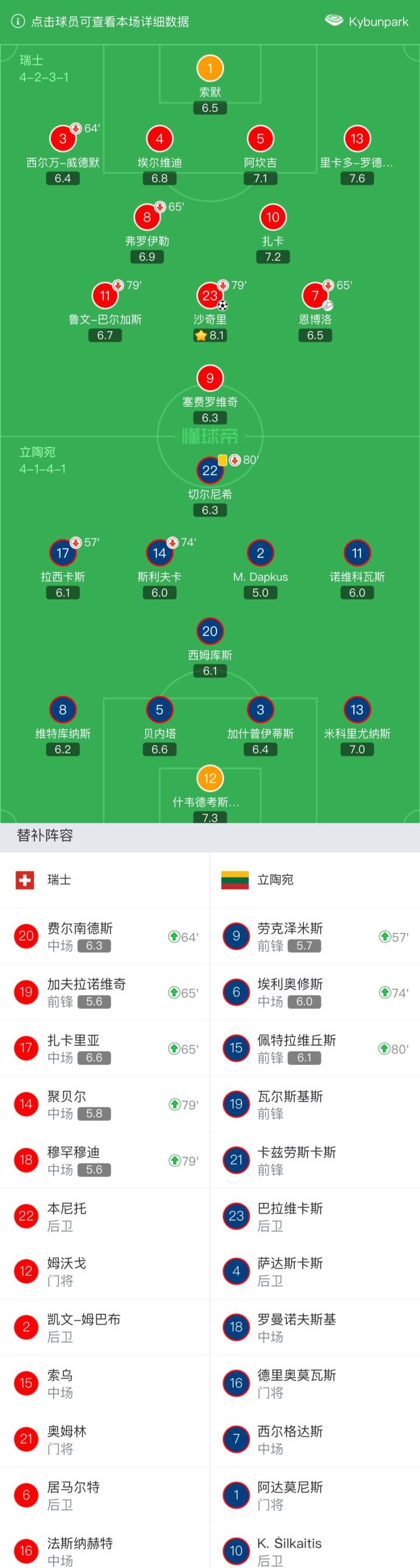 瑞士首发:1-索默、13-里卡多-罗德里格斯、5-阿坎吉、4-埃尔维迪、3-西尔万-威德默(64`20-费尔南德斯)、10-扎卡、8-弗罗伊勒(65`17-扎卡里亚)、23-沙奇里(79`18-穆罕穆迪)、7-恩博洛(65`19-加夫拉诺维奇)、11-鲁文-巴尔加斯(79`14-聚贝尔)、9-塞费罗维奇