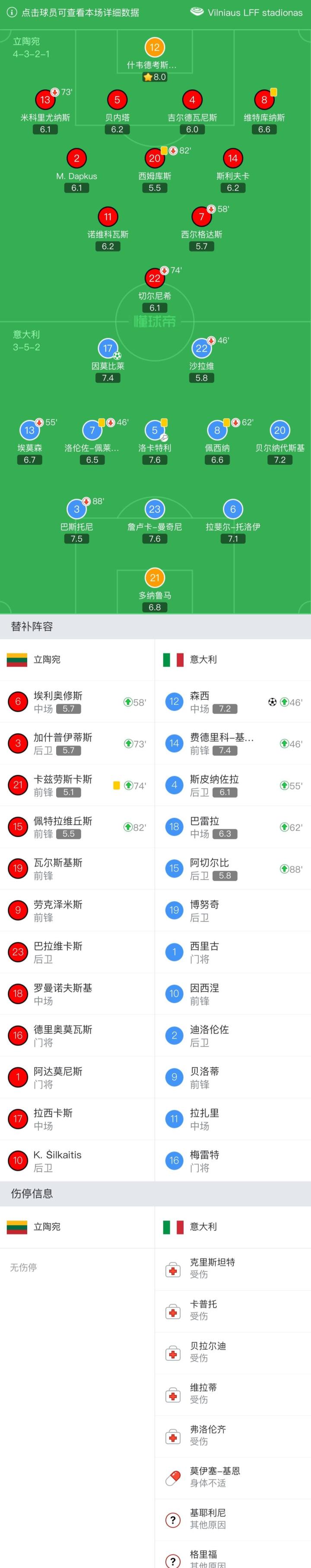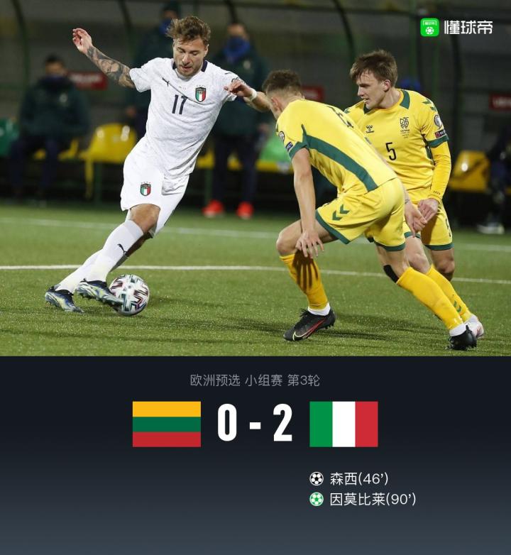 第47分钟,埃莫森横传,洛卡特利回做,刚刚替补登场的森西弧顶附近稍作调整起脚破门,立陶宛0-1意大利!