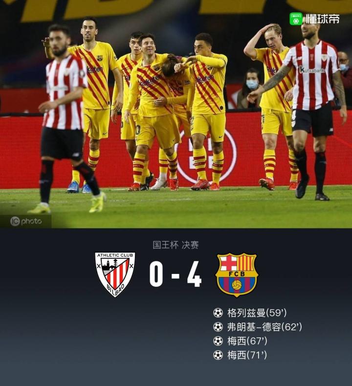 扫描下载懂球帝首页>动态> 巴萨4-0毕包夺20-21国王杯冠军,梅西双响,德容2传1射建功