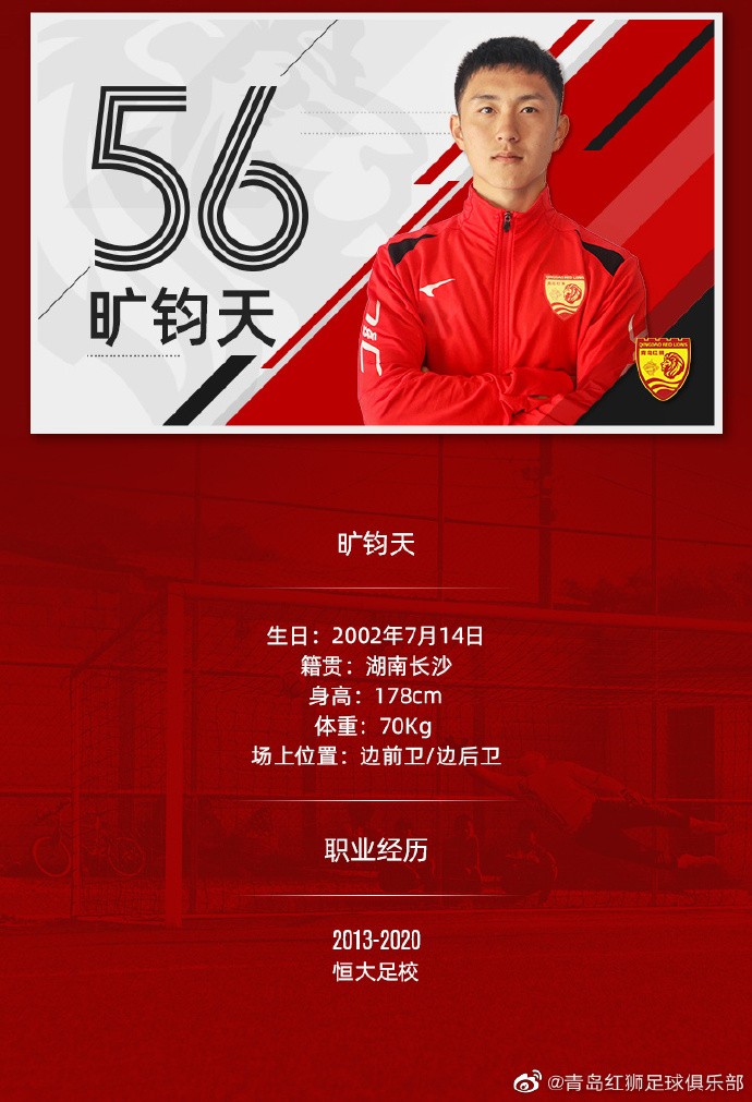 旷钧天,恒大西班牙分校02梯队,边后卫。原来主要踢右后卫,受伤病影响,球队中卫吃紧,原左后卫卢琪内收踢左中卫,旷钧天改踢左后卫。