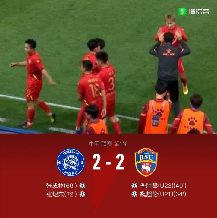 北京时间4月25日19:35,中甲第1轮继续进行,昆山对阵北京北体大。上半场,彭鹏出击失误,季胜攀抓住机会包抄铲射空门得手。下半场,阎相闯斜塞助攻魏超伦单刀扩大优势,随后徐骏敏先后助攻张成林与张煜东破门,助昆山连扳两城追平比分。最终,昆山2-2战平北体大。