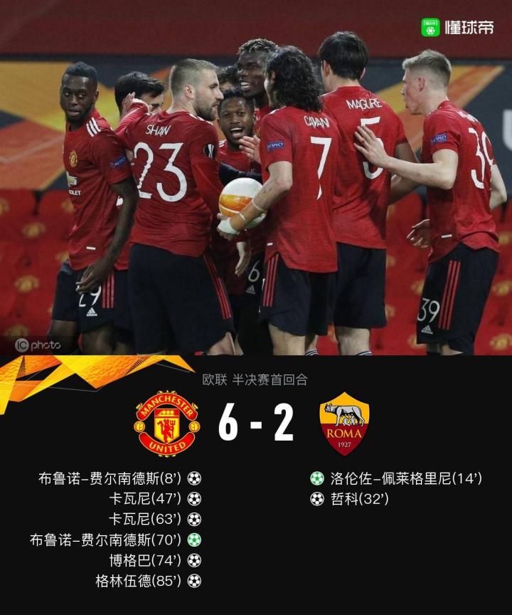 北京时间4月30日03:00,欧联半决赛首回合,曼联主场迎战罗马。上半场B费率先破门,博格巴送点,佩莱格里尼主罚扳平比分,哲科进球反超,韦勒图、保-洛佩斯、斯皮纳佐拉伤退。下半场卡瓦尼梅开二度,B费点射,博格巴头球破门,格林伍德替补建功。最终,曼联6-2罗马。