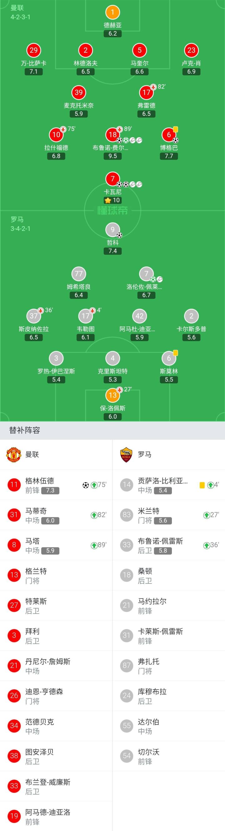 第74分钟,B费挑传,博格巴禁区头槌破门。曼联5-2罗马。