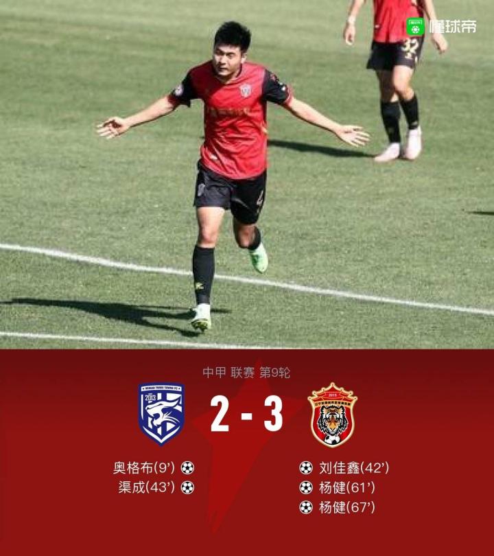 北京时间6月5日15:30,中甲第9轮继续进行,武汉三镇对阵辽宁沈阳城市。上半场,奥格布凌空端射首开记录,刘佳鑫单骑闯关扳平比分,渠成头槌助武汉三镇迅速重夺领先优势。下半场,杨健任意球+点射破门完成梅开二度,助沈阳城市连下两城实现逆转,韩震本场发挥神勇三扑单刀。最终,沈阳城市两度落后的情况下3-2逆转武汉三镇。