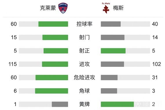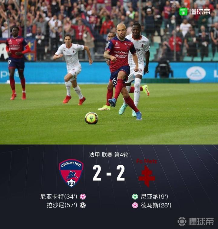 第57分钟,克莱蒙扳平比分,拉沙尼在禁区内无人盯防,面对门将将球捅入球网,克莱蒙2-2梅斯。