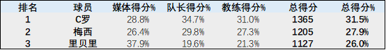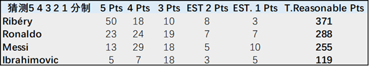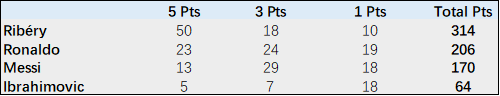 而法国足球的投票规则是5个名额,(5分、4分、3分、2分、1分),而不是合并后的3个名额,按照以前的规则,经过统计和合理推断,里贝里以371分位列第一,C罗略微领先梅西排在第2。