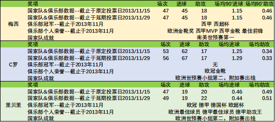 (图)2013年金球奖投票截止日梅西C罗里贝里数据和荣誉对比