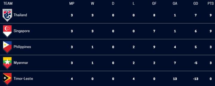 2020“铃木杯”东南亚锦标赛A组第4轮比赛结束,泰国和东道主新加坡分别取胜、同积9分,已提前一轮携手出线;菲律宾、缅甸、东帝汶则小组出局,其中东帝汶的比赛已经踢完,全部失利、一球未进、丢13球。