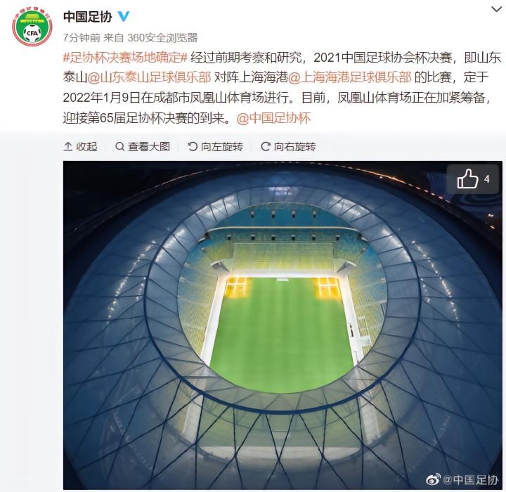 经过前期考察和研究,2021中国足球协会杯决赛,即山东泰山对阵上海海港的比赛,定于2022年1月9日在成都市凤凰山体育场进行。