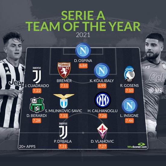 扫描下载懂球帝首页>动态> 懂球号> Whoscored意甲年度最佳阵容,那不勒斯3人