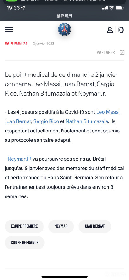 扫描下载懂球帝首页>动态> 懂球号> 巴黎官方宣布,队内四名感染新冠的球员分别是梅西、...