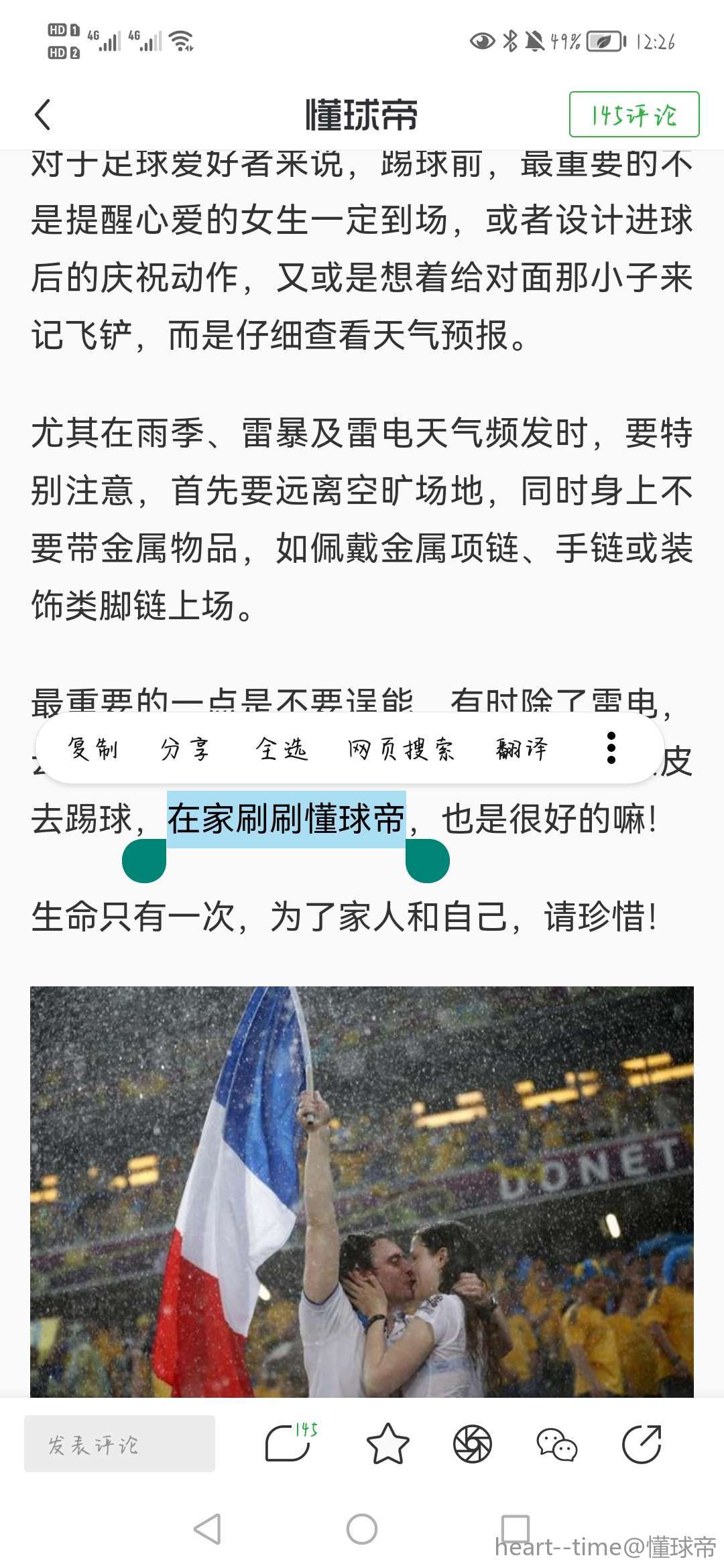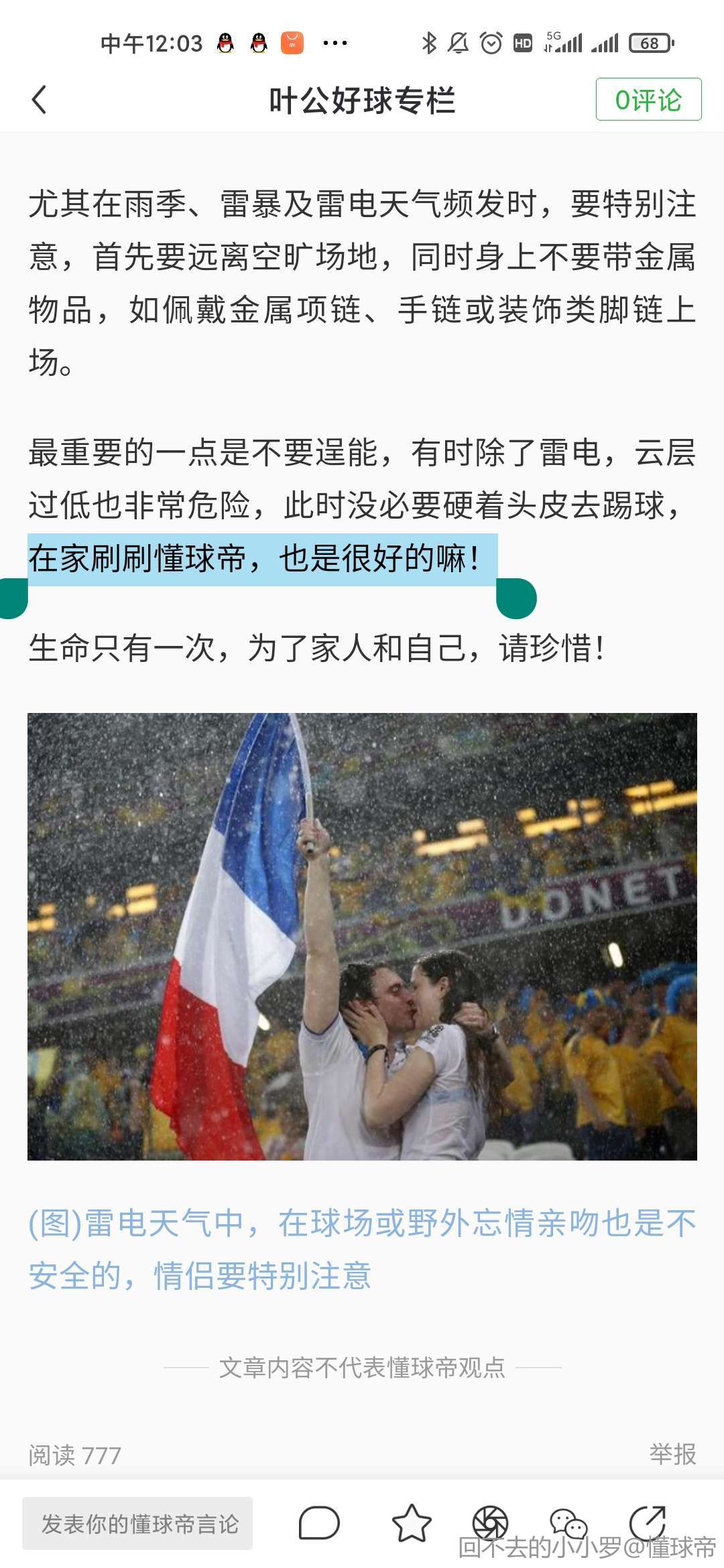 最重要的一点是不要逞能,有时除了雷电,云层过低也非常危险,此时没必要硬着头皮去踢球,在家刷刷懂球帝,也是很好的嘛!