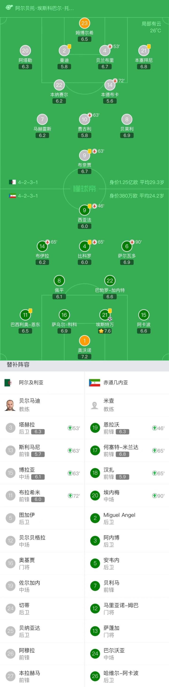 阿尔及利亚首发:23-姆博尔希、20-阿塔勒、21-本塞拜尼、4-贝兰布里(53'3-塔赫拉)、2-曼迪、10-费古利(63'15-博拉亚)、14-本德布卡(72'11-布拉希米)、8-贝莱利、7-马赫雷斯、22-本纳赛尔、9-布奈贾(63'13-斯利马尼)