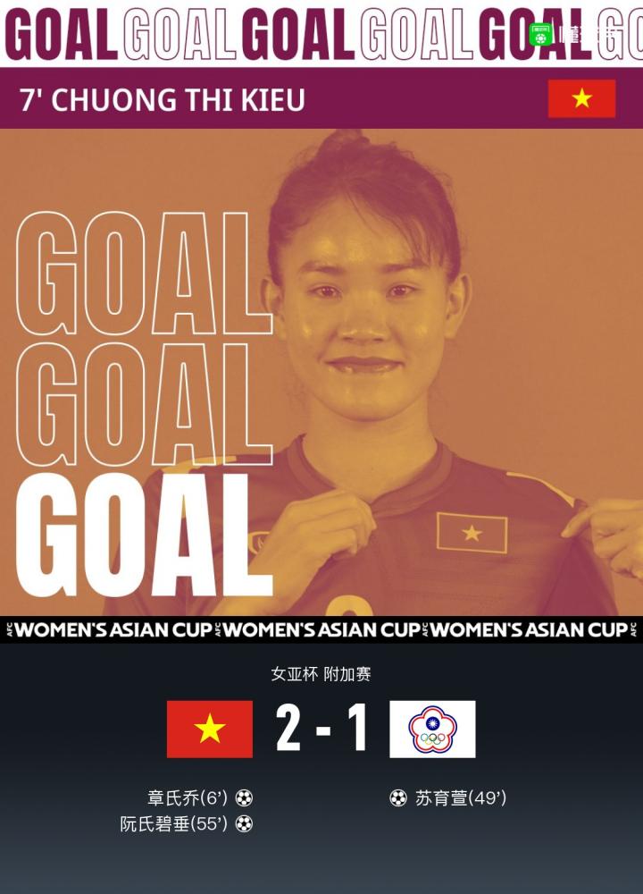 北京时间2月6日15:30,女足亚洲杯附加赛展开较量,越南女足对战中国台北女足,上半场章氏乔头球破门,陈燕萍门前包抄破门被吹无效。下半场苏育萱小角度破门扳平比分,阮氏碧垂劲射破门再度取得领先。全场结束,越南女足2-1中国台北女足,越南女足拿到了世界杯的参赛资格,中国台北女足将会参加洲际附加赛。