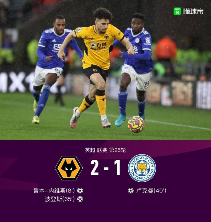 扫描下载懂球帝首页>动态> 狼队2-1莱斯特城,波登斯贴地斩制胜,内维斯、卢克曼破门