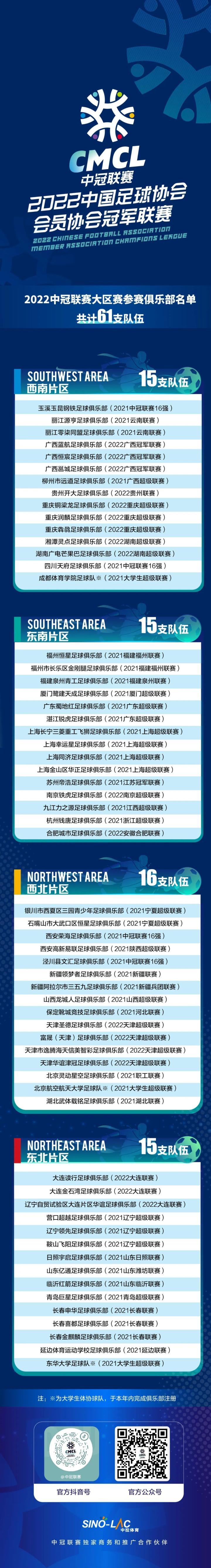扫描下载懂球帝首页>动态> 61支球队参加2022中冠联赛大区赛,3支重庆队伍报名