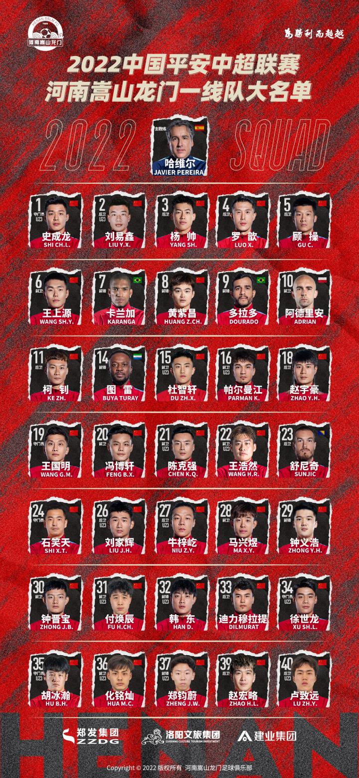 扫描下载懂球帝首页>动态> 懂球号> 2022中国平安中超联赛河南嵩山龙门一线队大名单