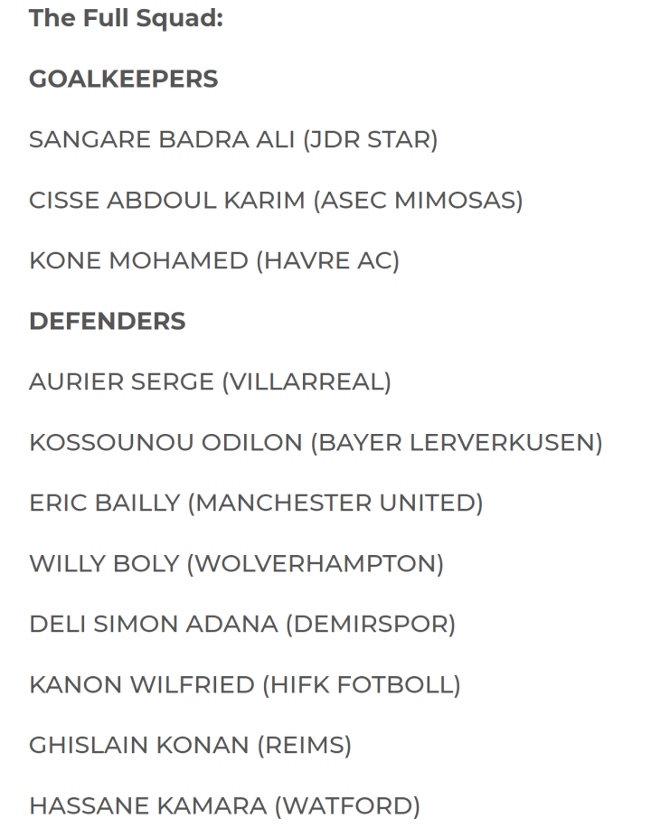 后卫(8人):奥里耶(比利亚雷亚尔)、奥迪隆·科苏努(勒沃库森)、埃里克·拜利(曼彻斯特联)、威利·博利(伍尔弗汉普顿)、西蒙·阿达纳(代米尔体育)、吉斯莱恩·科南(兰斯)、哈萨内·卡马拉(沃特福德)、卡农(赫尔辛基IFK)