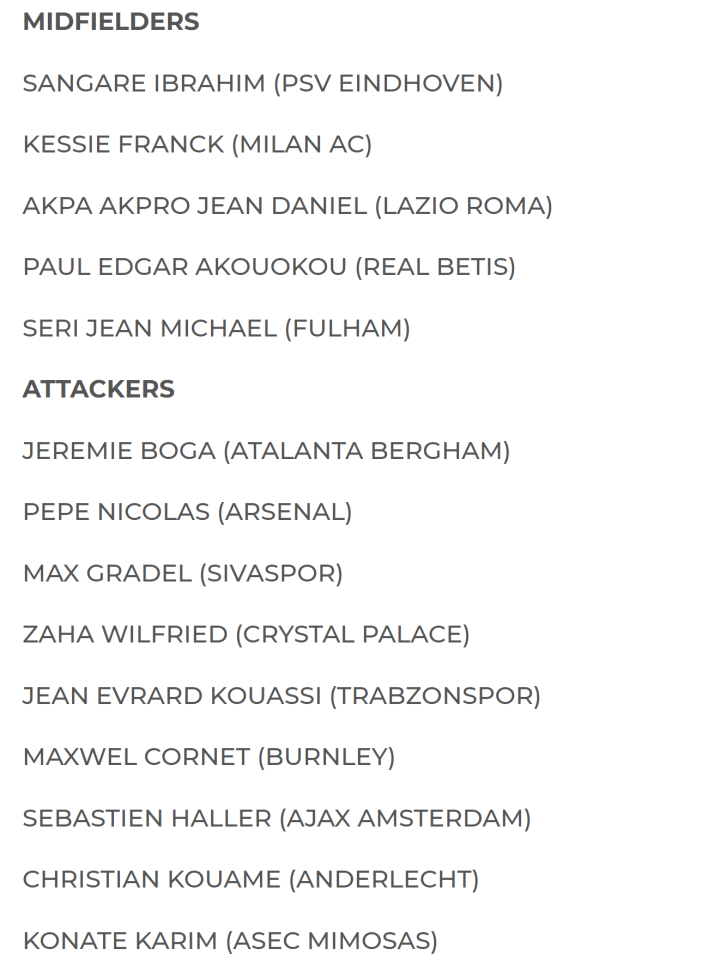 前锋(9人):博加(阿特兰大)、尼古拉斯·佩佩(阿森纳)、格拉德尔(锡瓦斯体育)、威尔弗雷德·扎哈(水晶宫)、埃弗拉·夸西(特拉布宗体育)、科尔内(伯恩利)、塞巴斯蒂安·阿莱(阿贾克斯)、克里斯蒂安·夸梅(安德莱赫特)、卡里姆·科纳特(科特迪瓦-ASEC米莫萨)