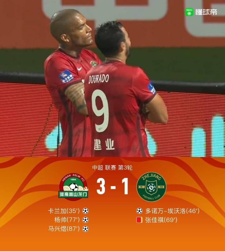 北京时间6月11日19:30,中超第3轮继续进行,河南嵩山龙门对阵浙江。上半场,卡兰加抓住高天语低级失误破门,连续三轮取得进球。下半场,高天语将功补过助攻埃沃洛鱼跃冲顶打入浙江重返中超首球;随后张佳祺累计两黄被罚下,杨帅与马兴煜分别建功,河南连下两城锁定胜局,岳鑫补时阶段进球无效。最终,河南3-1击败十人浙江,迎来联赛两连胜。