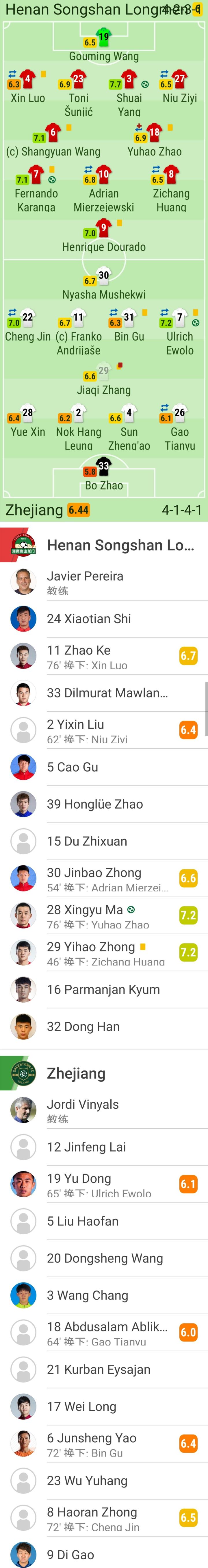 浙江首发:33-赵博、4-孙正傲、29-张佳祺、2-梁诺恒、26-高天语(U23)(63'18-阿布力克木-阿布都沙拉木(U23))、22-程进(71'8-钟浩然)、31-顾斌(71'6-姚均晟)、28-岳鑫、11-安德里亚舍维奇、7-多诺万-埃沃洛(64'19-董宇)、30-穆谢奎