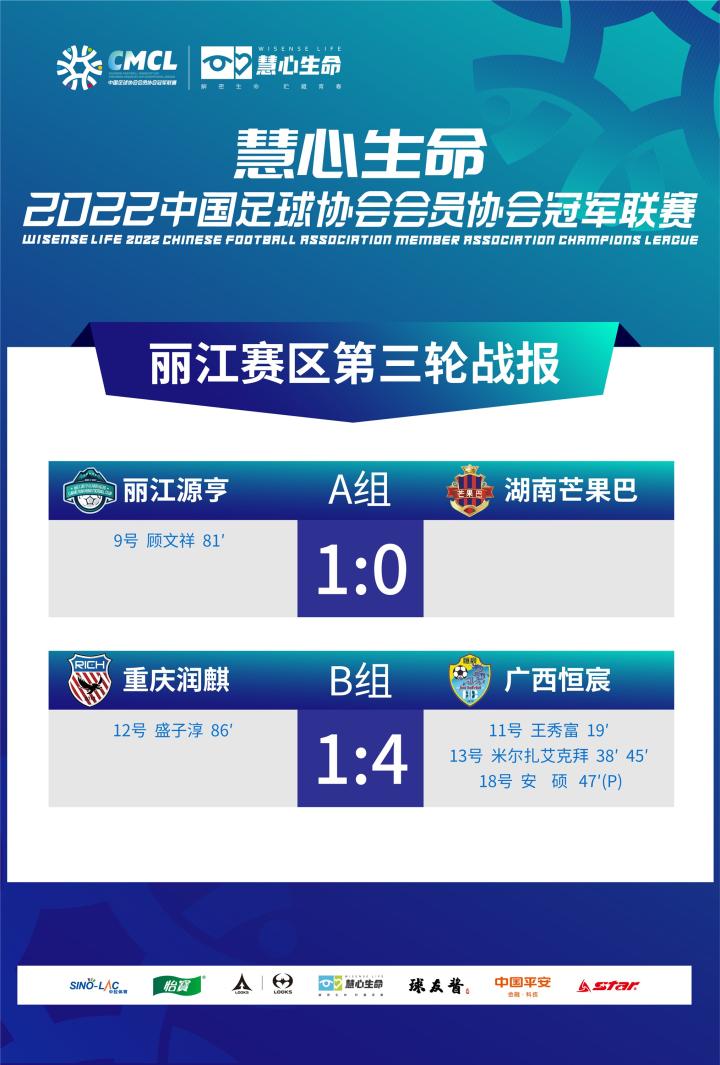 6月22日下午,中冠联赛丽江赛区结束小组赛的全部争夺,广西恒宸大胜重庆润麒以全胜战绩出线,交叉淘汰赛将对阵A组第二湖南芒果巴。