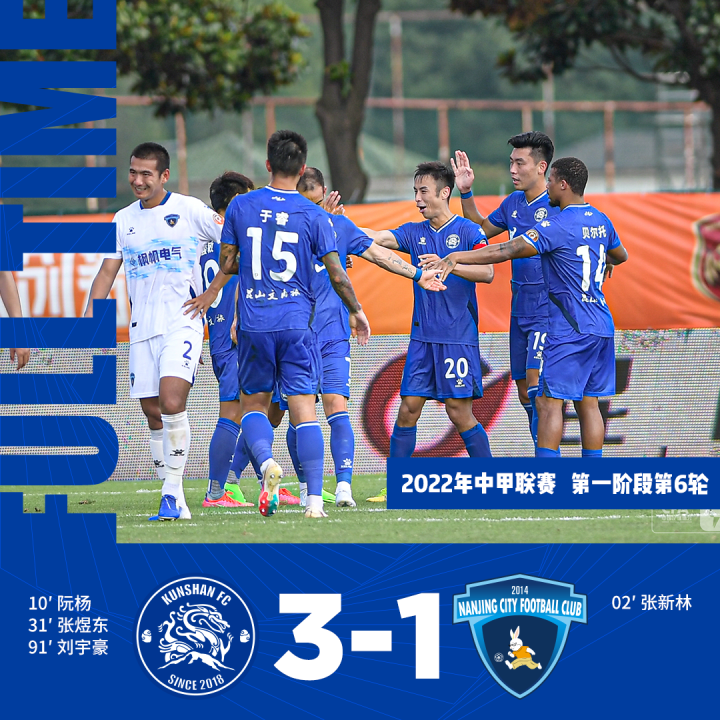 2022赛季中甲第6轮,昆山队再战南京城市!对手开局先进一球,阮杨迅速扳平比分,张煜东头球将比分反超,昆山队半场2-1领先。易边再战,李智、阿卜先后制造威胁,彭鹏补时阶段球门球助攻刘宇豪破门锁定胜局。最终,昆山队3-1击败南京城市,收获联赛4连胜!