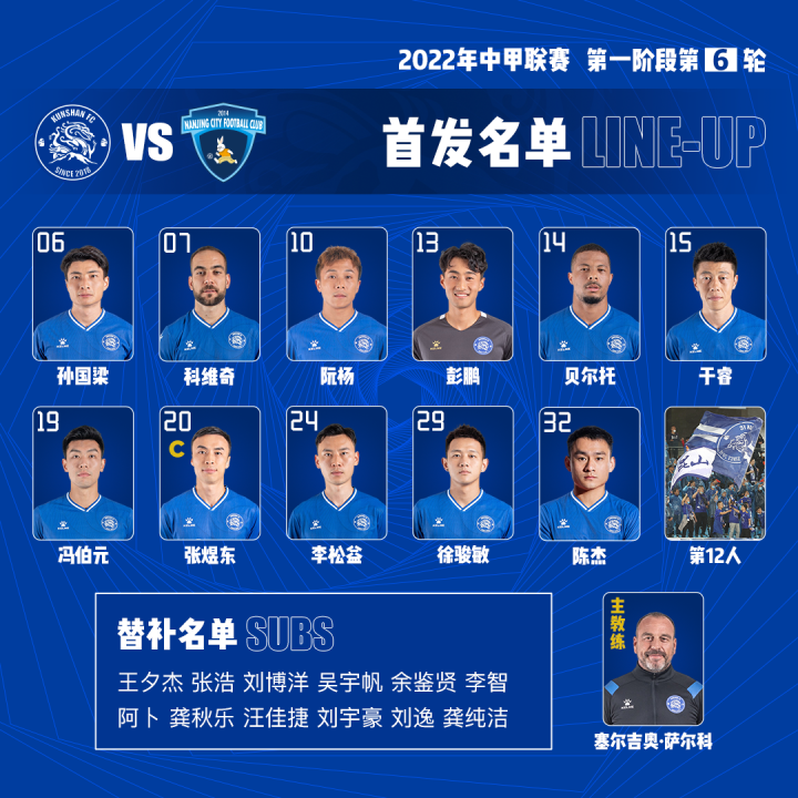 昆山队:6-孙国梁、7-科维奇(F)、10-阮杨(70' 18-龚秋乐(U23))、13-彭鹏(GK U23)、14-贝尔托(F)(64' 17-阿卜(U23))、15-于睿、19-冯伯元(70' 5-张浩)、20-张煜东(C)(86' 25-刘宇豪)、24-李松益、29-徐骏敏(46' 16-李智)、32-陈杰