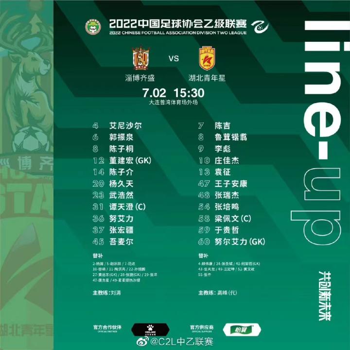 7月2日15:30,2022赛季中乙联赛第一阶段大连赛区第一轮,湖北青年星迎战首个对手淄博齐盛。主教练高峰排出了433阵型,有6名U21球员首发。凭借李彪和袁征分别在上下半场的入球,湖北青年星2比1战胜淄博齐盛,取得了赛季开门红。17岁的于贵哲、黄文政和18岁的门将努尔艾力完成职业生涯首秀。