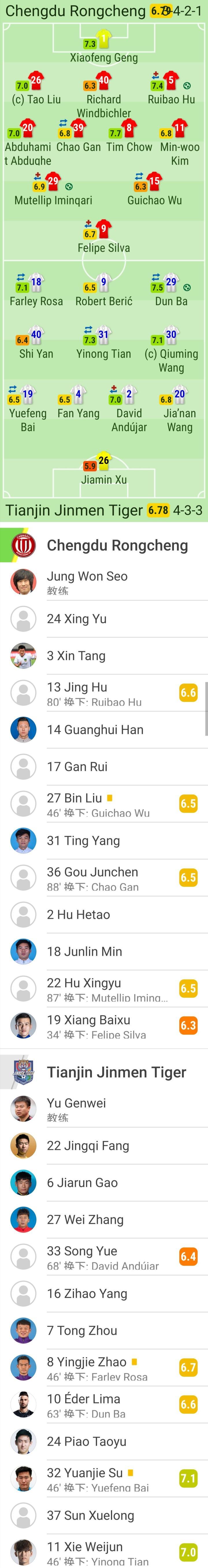 成都蓉城首发:1-耿晓峰、5-胡睿宝(79'13-胡靖)、40-理查德-温德比希勒、26-刘涛、20-阿不都海米提、11-金敃友、15-吴贵超(46'27-刘斌)、39-甘超(87'36-勾俊晨)、8-周定洋、9-费利佩(33'19-向柏旭)、29-木塔力甫-依明卡日(U23)(87'22-胡兴雨(U23))