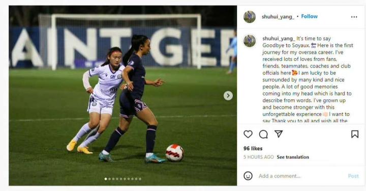 中国女足球员杨淑慧在社交媒体上发文向法甲女足夏朗德苏瓦约俱乐部道别。