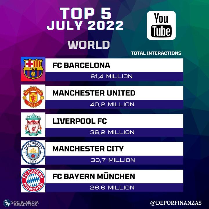 扫描下载懂球帝首页>动态> 懂球号> 2022 年 7 月,youtube上5 家最受...