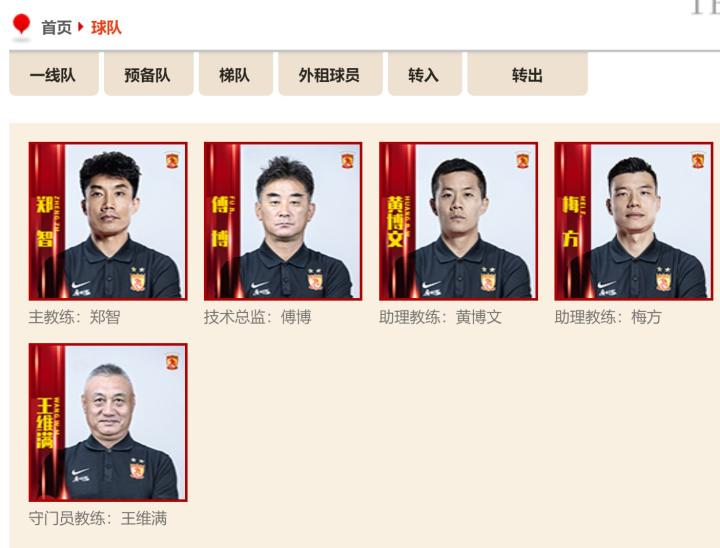 根据广州队官网最新的一线队教练组团队名单,郑智担任主教练,傅博担任技术总监,黄博文、梅方担任助理教练,王维满担任守门员教练。